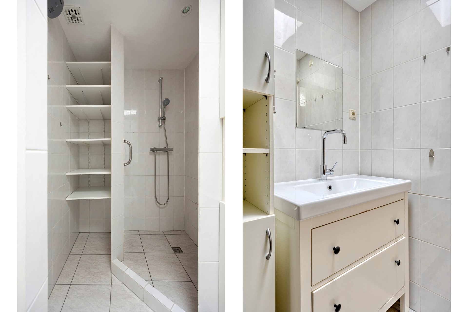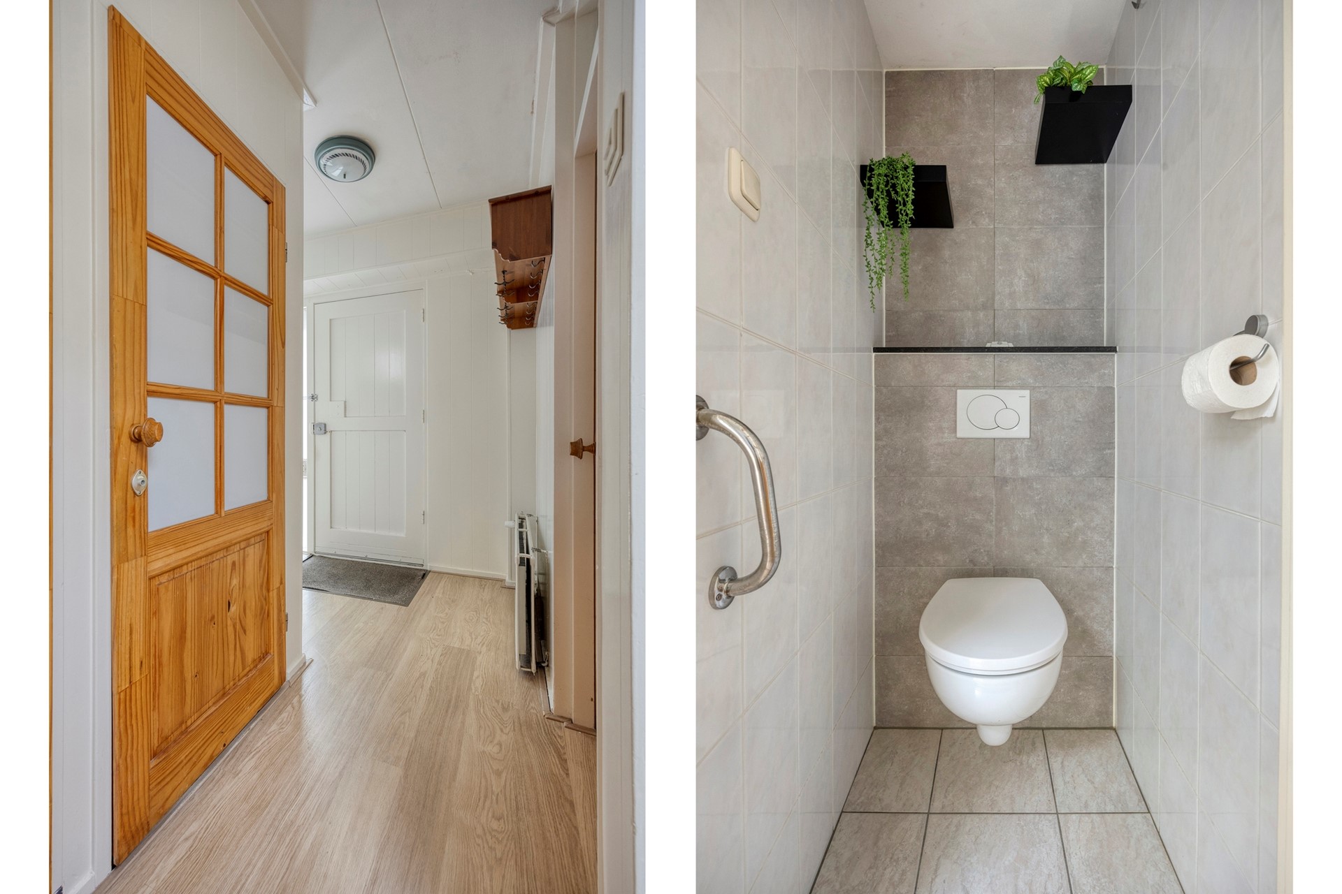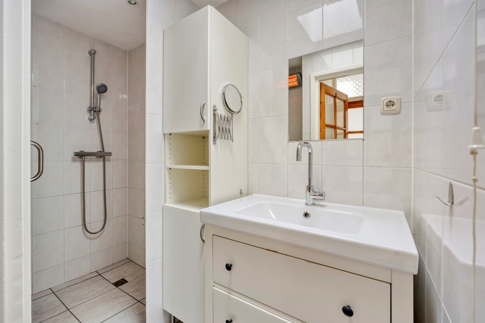 Aan de buitenzijde bevindt zich de meterkast (10 groepen en 3 aardlekschakelaars). Via de entree betreed je de hal met toegang tot een separaat toilet en een bergruimte met CV-ketelopstelling. Tevens bevinden zich hier een kleine slaapkamer en de badkamer, welke is voorzien van een douchehoek en een wastafelmeubel.